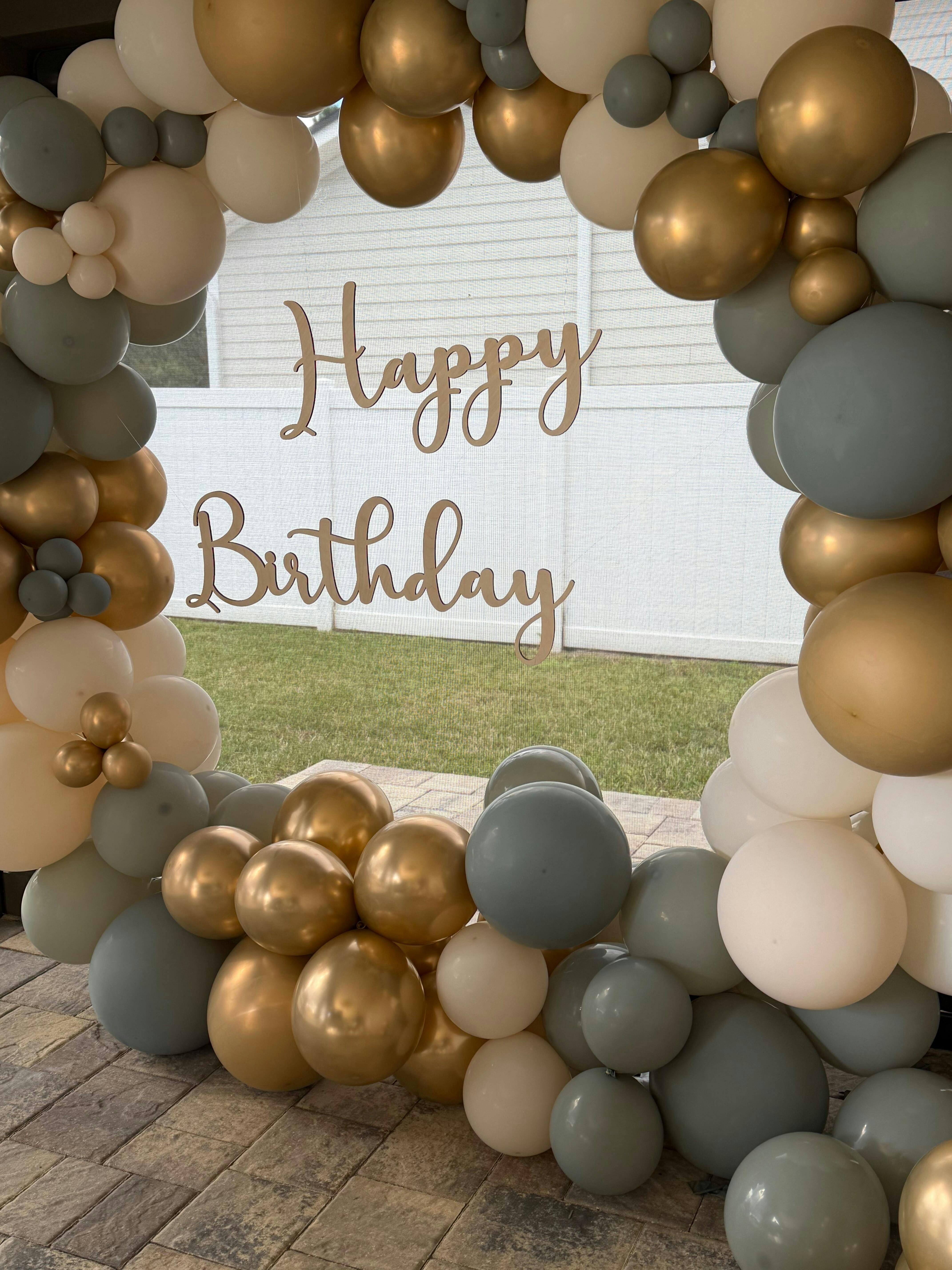 - Premium latex balloon colors: White Sand, Mirror Chrome Gold, Sage Green