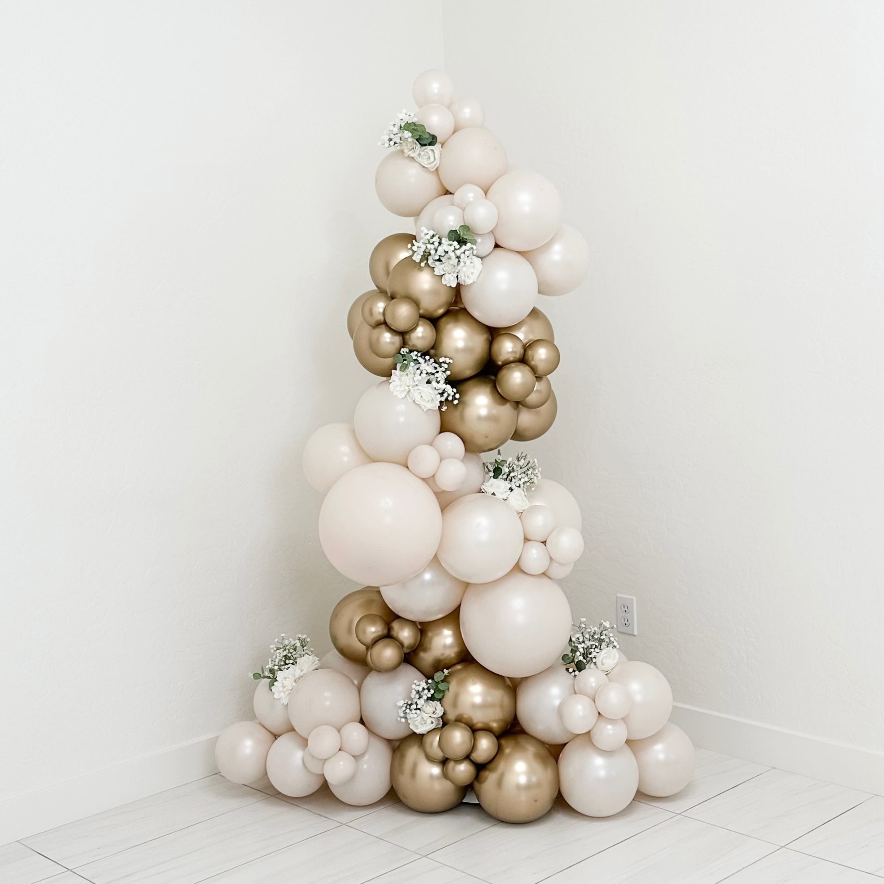 - Premium latex balloon colors: White Sand, Chrome Gold, Double Stuff White Sand Pearl